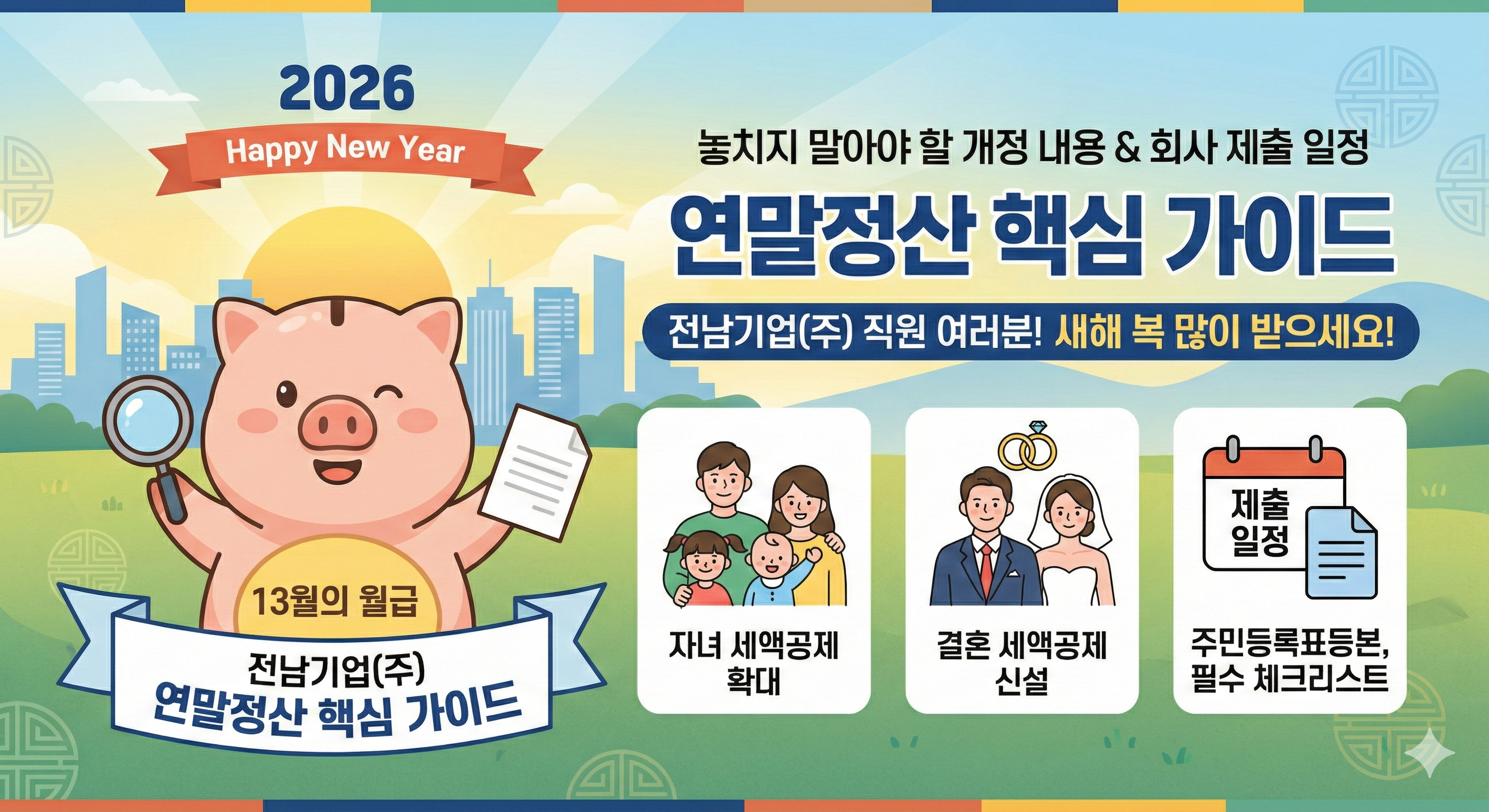 오늘은 전남기업(주) 직원분들을 위해 이번 연말정산에서 놓치지 말아야 할 개정 내용과 회사 제출 일정, 그리고 주민등록표등본 제출 등 필수 체크리스트를 중심으로 핵심만 정리해 드리겠습니다.
